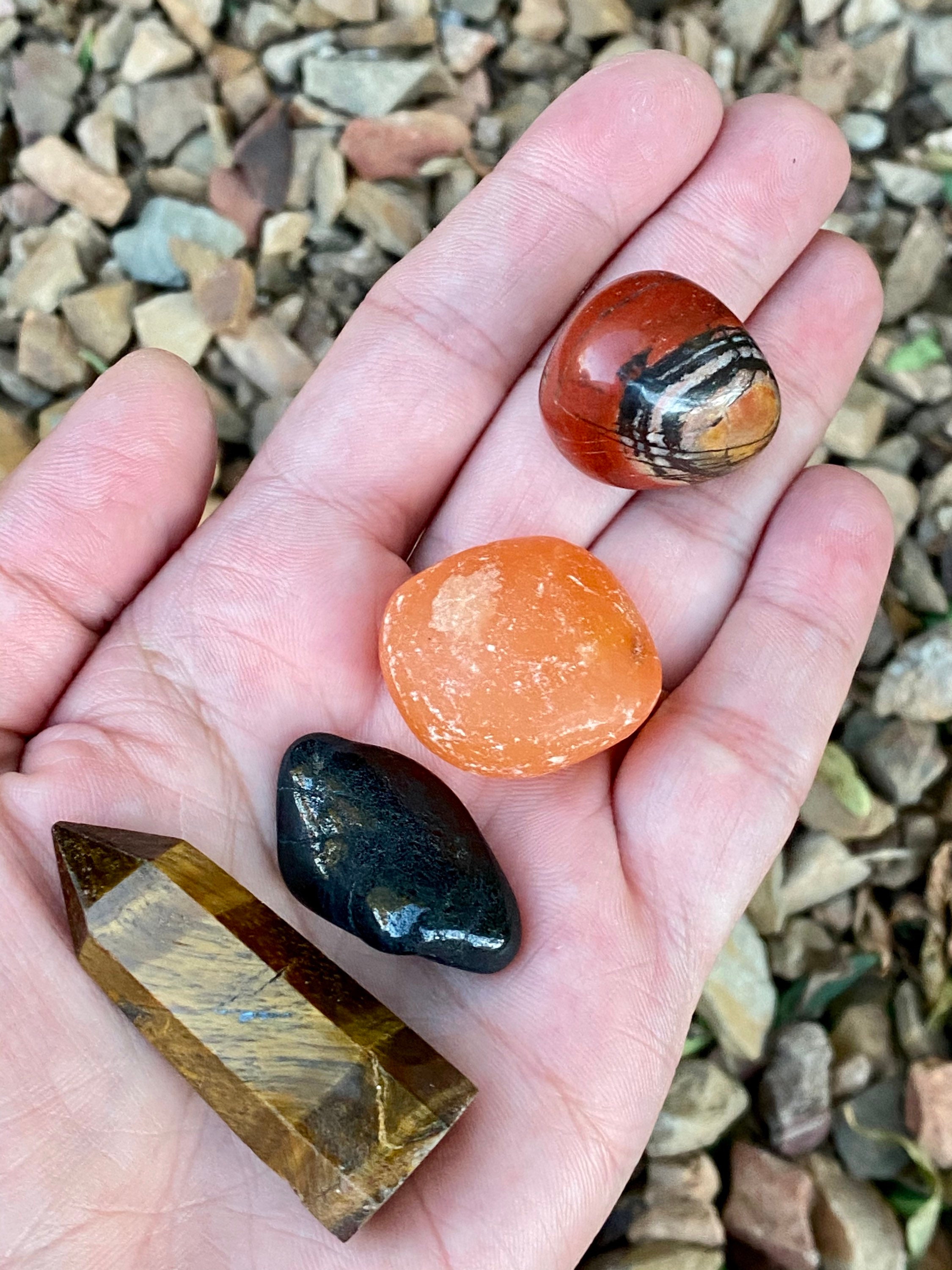 Crystals for Courage, Crystal Collection, Tiger’s Eye Point, Selenite Bar, Tumbled Carnelian