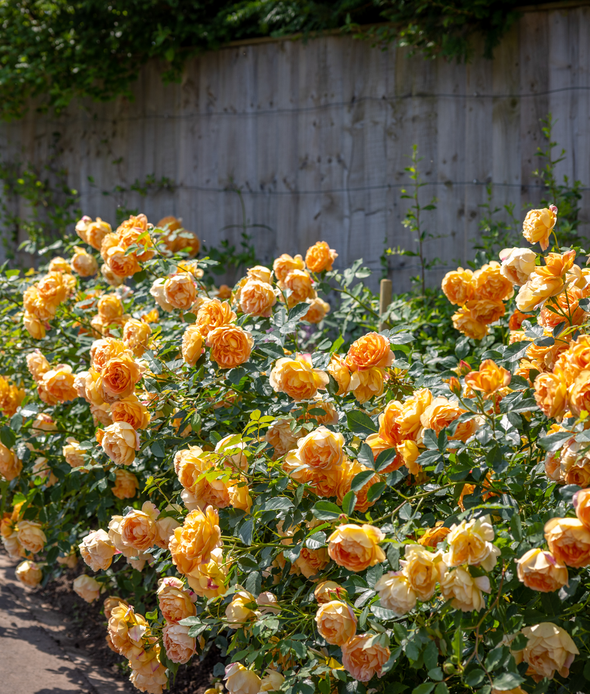 Size:Large Shrub125cm 110cm. Bloom Size:Large. A joyously warm and inviting variety bearing deeply filled, cupped rosette blooms of rich sunset orange-yellow paling to lighter apricot tones over time. A healthy and upright, bushy shrub with a complex medium-strong Myrrh fragrance.