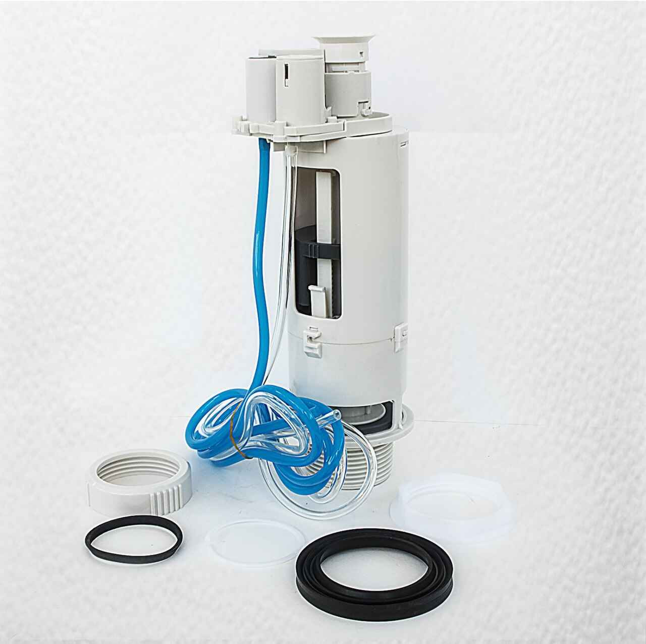 Macdee Kayla Pneumatic Flush Valve - 2". MACDEE Kayla air operated dual flush valve has an adjustable overflow, two flexible hoses (approx. 500 mm long), 2" outlet connection with flush pipe nut, seal and washer. Dual flush volumes can be adjusted to 6/3 litre, 5/3 litre and 4/2.6 litre. Flush button not supplied, please see P/Ns 20013/4/5.
