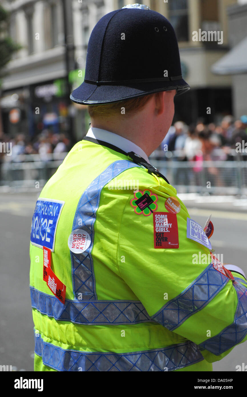 Oxford Street, London, UK. 29th June 2013. A Police Officer with stickers all over his jacket on