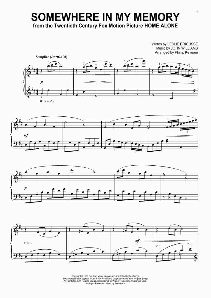 Sheet music arranged for Easy Piano in D Major. SKU: MN0017584. sheet music for Somewhere in My Memory from Home Alone. Sheet music arranged for Easy Piano in D Major. Insufficient Pro Credits Add 3 credits for only $12.99 Add to Cart Cancel. Musicnotes Pro Send a Gift Card. Hi..