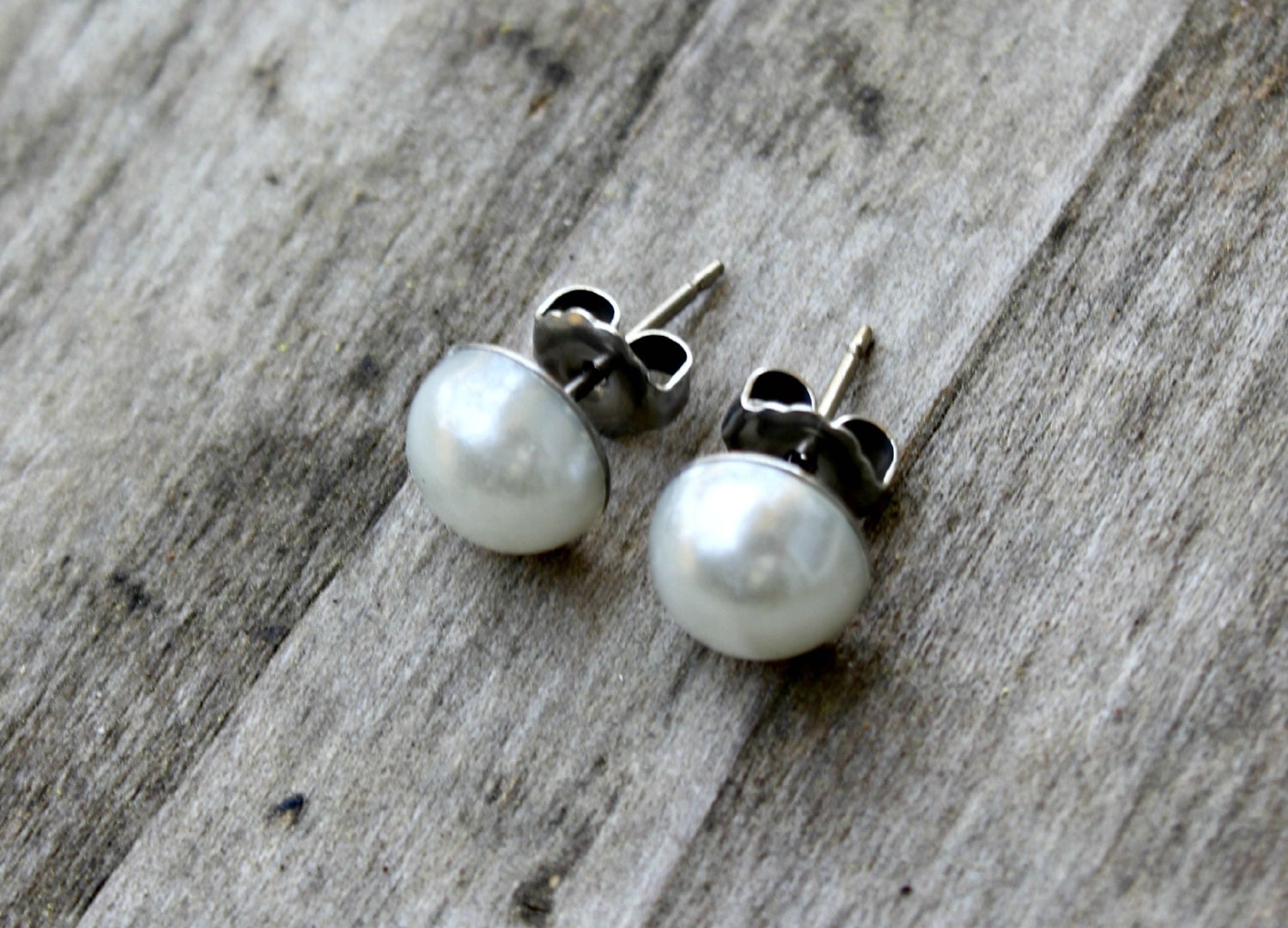 Pearl Titanium Earrings Faux Flat Back White Pearls 8 mm